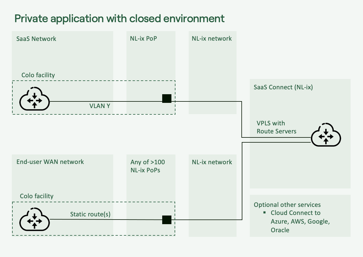 Instead of routing sensitive traffic across uncontrolled Internet paths, users connect via a dedicated port at NL-ix. From there, traffic is automatically and securely routed to the SaaS application.